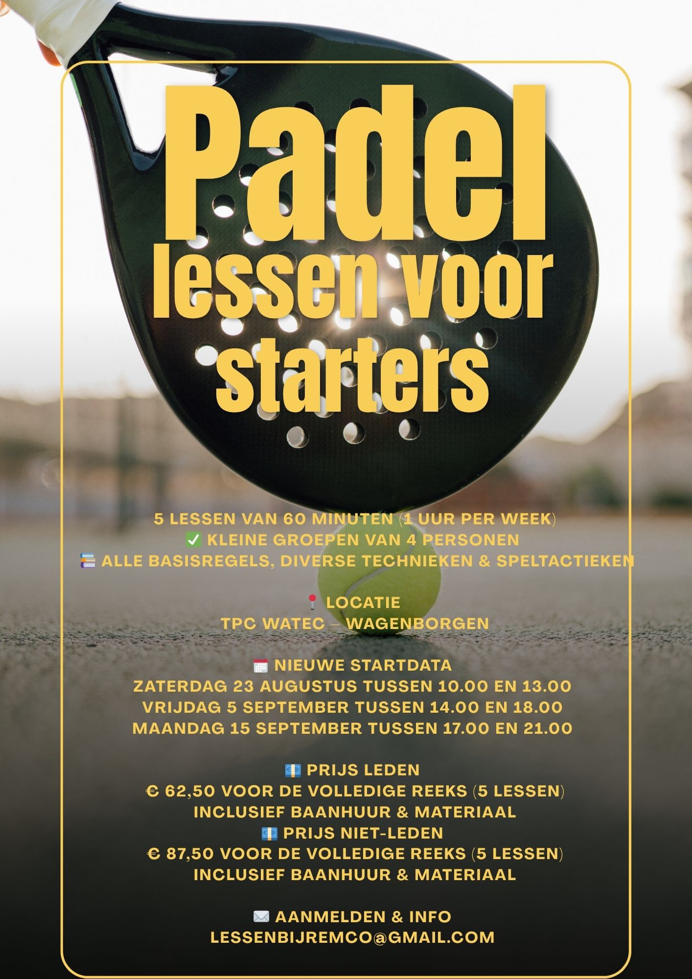 Remco van den Berg gaat voor ons padellessen geven voor starters. We zijn hem daar erg dankbaar voor. Hiermee wordt nog voor de vakanties gestart. Op de poster hieronder vind je meer info omtrent de lessen. Aanmelden gaat via Remco.